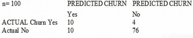 The model produces the following confusion matrix after evaluating on a test dataset of 100 customers: