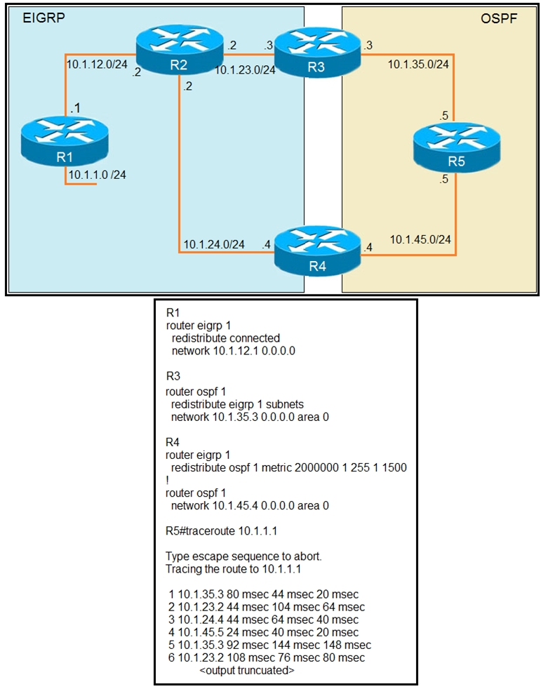Refer to the exhibits. The output of the trace route from R5 shows a loop in the network.