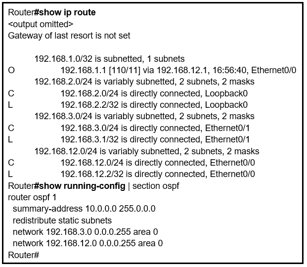 Refer to the exhibit. An engineer is trying to generate a summary route in OSPF for network 10.0.0.0/8, but the summary route does not show up in the routing table.