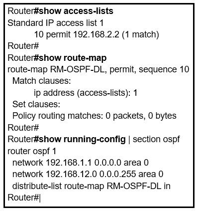 Refer to the exhibit. An engineer is trying to block the route to 192.168.2.2 from the routing table by using the configuration that is shown. The route is still present in the routing table as an OSPF route.