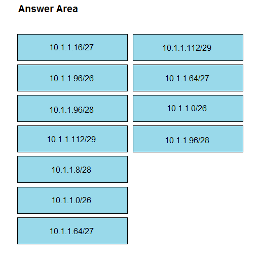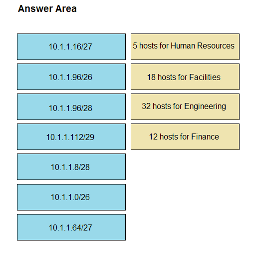 An engineer is designing an addressing plan for a small business using a single /24 network. Each department must have its own subnet. Drag and drop the subnets from the left onto the requirements of the department they fulfill on the right. Not all options are used.